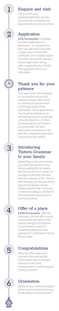Apply online using the link above. Our Admissions office will acknowledge your application and payment. For more information regarding international enrolments at Tintern Grammar, please visit our International Enrolments page.